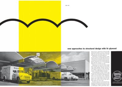 Other notable work by the firm in Seattle included the Encyclopedia Americana Building (1960); the chapel and educational wing at Seattle First Presbyterian Church (1962); the Ballard Library (1963); the infamous “Sinking Ship Garage” in Pioneer Square (1965); the Bay Shore Apartments on Portage Bay; and a Flight Simulator building for the U.S. Air Force in Tacoma.