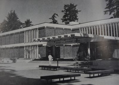 Upon Jones’ retirement in 1956, John LeBaron Wright joined Bindon, and the firm was renamed Bindon & Wright. Together, the two partners received many large design commissions. Among their first was the glass curtain wall Seattle City Light Building (1957). Their skill in using this new construction technology led them to partner with the well-known San Francisco office of Skidmore, Owings, & Merrill to design the Norton Building in downtown Seattle. Completed in 1959, the 16-story building is recognized as the city’s first modern office tower and won a Seattle Chapter AIA Honor Award in 1960. Several large projects followed including the downtown branch of the Seattle Public Library with architects Decker, Christenson & Kitchin (1959, demolished); an addition to the Suzzallo Library on the University of Washington Campus (1963); the library at Pacific Lutheran University in Tacoma (1966), and Seattle Fire Stations No. 32 and No. 40 (1965).
