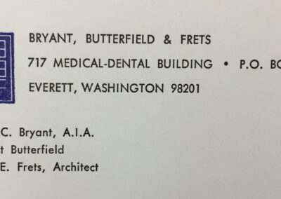 After Aehle left in 1960, Bryant and Butterfield promoted Jack Frets to become a partner (1960-1970). Together projects include the Bank of Everett (1964), the Casino Equipment Building (1968) and General Telephone Co. Building (1968) in Everett, Baker View Apartments (1968) for the Everett Housing Authority, and a support center complex (1968) in Coos Bay, Oregon.