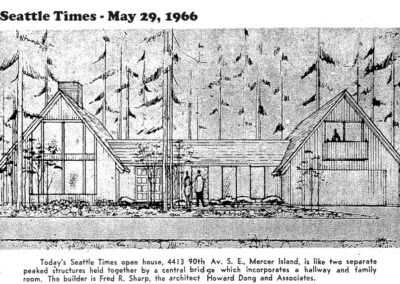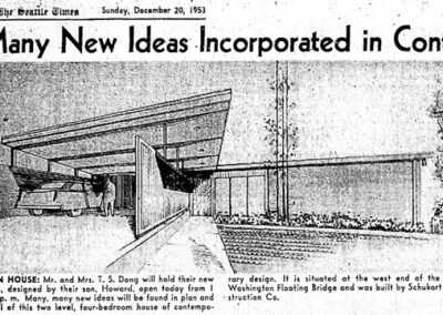 A talented student, Dong actually designed a home for his parents at 1514 35th Avenue (1953) while still in school. The house received wide praise and was featured multiple times in the Seattle Times. Other single-family homes include a residence at 7522 27th Ave NE (1964), and a home at 4413 90th Ave SE on Mercer Island (1966).