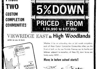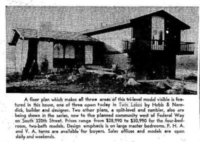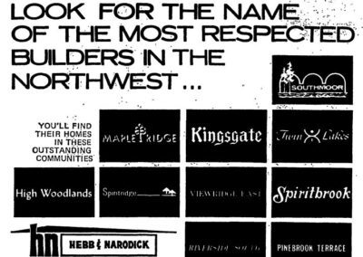 The partnership was a perfect fit, with Hebb offering his years of building skills and connections to sub-contractors, and Narodick bringing his business acumen and financial backing. Under the name, “Hebb & Narodick Construction Company,” the business grew quickly, eventually becoming one of the largest home construction companies in the Pacific Northwest (and ranked 112th largest in volume in the U.S – 1969). Over the course of their careers, they reportedly built over 10,000 custom homes and apartment buildings scattered across the Puget Sound area. Mainly located in over 200 subdivisions in the Seattle area, they also built housing in Bremerton, Anacortes, Spokane, Tacoma, Bellingham, Fairbanks and Hawaii.