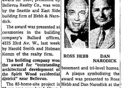 Notable projects by Hebb & Narodick include 140+ homes in the Bow Lake development (1954 with Durham, Anderson & Freed, Architects, featured in the 1954 & 1955 Parade of Homes) in Sea Tac, more than seventy-five homes in the Spiritwood development (1956 with Durham, Anderson & Freed, 1957 Parade of Homes) in Bellevue; the senior Capehart Housing project at Fairchild Air Force Base (1959) in Spokane; more than one-hundred residences in the South Shore Hills Development (1959) in Des Moines; more than one-hundred-ten homes in the Spiritwood development No. 3 (1961 with Lawrence S. Higgins) in Bellevue; homes in the Spiritridge development (1962) in Bellevue; more than five-hundred homes in the Kingsgate development (1965 with Lawrence S. Higgins) in Kirkland; in excess of two-hundred dwellings in the Viewridge development (1965 with Lawrence S. Higgins) in Redmond, a project which received a national award citation from Weyerhauser; Salt Water Park West development (1967 with Sassonoff & Mecklenburg) in Des Moines; and more than one-hundred homes in the Spiritbrook development (1967 with Lawrence S. Higgins) in Redmond. The Spiritbrook neighborhood received a lot of press for the construction of an “Idea House” developed with ideas supplied by a panel of sixty-eight, Seattle-area women. The home received a national award from Parents Magazine in 1968.