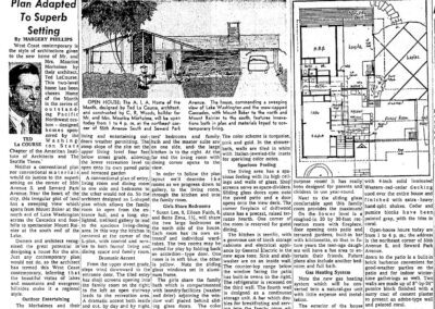 Several of his works were featured in local newspapers and LaCourse was a regular contributor to the Seattle Times AIA /Home-of-the-Month program. Known as a “builder’s architect,” he worked closely with many Seattle area builders providing them with modest, but thoughtful designs. His design for the Donald Davison House (1949) on the Sand Point Golf Course brought him much attention early in his career. The “brick and glass rambler” was featured in the Pacific Northwest Book of Homes (1949), the Seattle Times (April 10, 1949) and Better Homes & Gardens (November 1951). Other notable single-family residences include the Maurice Morhaime Residence (1956, Seattle Times/ AIA Home-of-the-Month, June 1956); a house at 5719 s Morgan Pl (1957); the G. Almira Residence (1957, Seattle Times/ AIA Home-of-the-Month, July 1957); and the Lloyd E. Erickson Residence (1961).