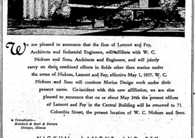 In 1957 Lamont & Fey formed a short-lived alliance with the Naval architect and engineering firm of W.C. Nickum & Sons. The new firm, known as Nickum, Lamont & Fey, designed several building together including the Seattle Art & Photo Supply Co. (1958). For reasons unknown, the partnership was dissolved in 1960.