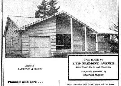 In 1943, Lawrence formed a lasting partnership with fellow UW and MIT graduate George W. Hazen. Their own office building at 8626 Roosevelt Way in Seattle won an AIA National Merit Award in 1953. The firm, which focused primarily on residential design, was published in a variety of architectural magazines including Popular Home, Architectural Record, and Better Homes & Gardens. Known projects include the John Irwin House (1940); the W.H. Connon Jr. House (1940); the Patricelli House (1947); the Floyd Flint House (1949); and the Susan Anne Apartments (1955) —all located in Seattle. Between 1954 and 1976, eleven designs by the firm were featured in the Seattle Times / AIA Home-of-the-Month program. The partnership also had the distinction of designing the first model home after WWII for the Seattle Home Show.