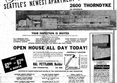 Other notable projects include the 2600 Thorndyke Apartments (1954); the Dr. Anderson Medical Clinic (1959); Crown Lutheran Church (1962); Morrison Building (1963) in Kenmore; and Bellevue First Baptist Church (1960).