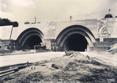 In 1932 Lovegren returned to Seattle and became the Senior Architectural Draftsman for the Seattle Parks Department (1932-1934). While there he designed the Laurelhurst Field House (1933). In 1935 he began work as a bridge architect for Washington State Highway Department (1935-1938), moving to the title of Architectural Engineer for Washington State Highways (1938-1940). This important position allowed him to design many high-profile commissions, most notably the Lake Washington Floating Bridge Tunnel Portals and Toll Buildings (1938-1940, with artist James Fitzgerald).