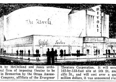 Notable Seattle designs include the College Center Building (1927) in the University District, the Dr. Hampson House in Ravenna, and the Silverstrom Building. In 1930, the two partners added Victor N. J. Jones to the partnership. Pinneh left the firm in 1932, but Jones remained with McClelland until 1943. A national award for Architectural Forum’s “Modernize Main Street” competition sponsored by the Libbey-Owens-Ford Glass Company in 1935 brought the two many commissions including several storefront remodels in downtown Seattle and Beyond. Notable projects the Bremerton Estate Theater (1935), the Bremerton Ferry Terminal (1938).