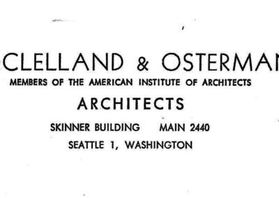 In 1952 McClelland promoted his associate, Hugo Osterman, to full partner and the firm was renamed McClelland & Osterman. Designs during this period include the Florence Crittenton Home for Unwed Mothers (1953); the Gladding, McBean & Company Building (1954) in Seattle; the Lundquist-Lilly Men’s Wear Store (1955); remodel of the downtown Nordstrom Shoe Store (1960); Foodland Store (1960); and an Insurance Office Building (1956) on Belmont Avenue.