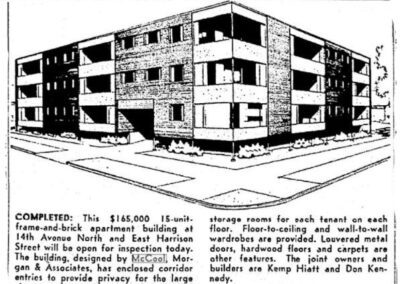 With work flooding into the office, in 1958 McCool promoted associate Charles E. Morgan to full partner. Together, McCool-Morgan & Associates specialized in low- to mid-rise apartment buildings, many of which can be found scattered in the Magnolia, Queen Anne and Capitol Hill neighborhoods of Seattle. Many of their designs are easily identified by their glass fronted stair towers, many of which often project above the main roof line. Notable projects include the Balboa Apartments (1958), the Kingshire Apartments (1958), the Hawaiian Apartments (1959), the Cape Flattery Apartments (1959), the Delphain Apartments (1961), the Dunbar Apartments (1961), the Fairview Apartments (1962), the Harbor House Apartments (1964), and the Camelot Apartments (1965).