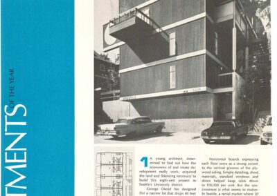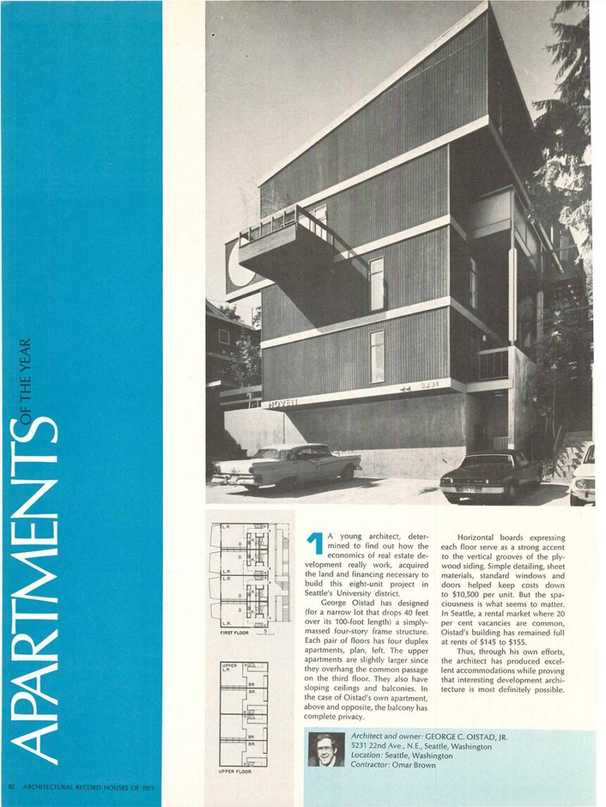 During his time with Morhanelli-Heumann, Oistad also worked on the interiors of the Holiday Inn in Bellevue (1969). Another notable project was an eight-unit apartment complex which he called the Hoven Apartments (1970; 5231 22nd Ave E). Located near the University of Washington campus. The building was designed for young married graduate students and served as home to Oistad and his wife for several years. The building was featured in a multi-page spread in the Seattle Times PNW Living section, and was the only Seattle dwelling featured as an “apartment of the year in the annual record of houses” in the 1971 issue of Architectural Record.