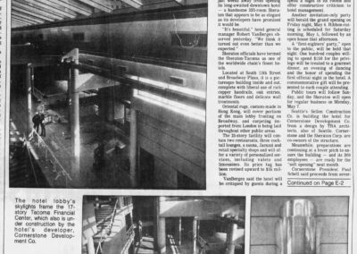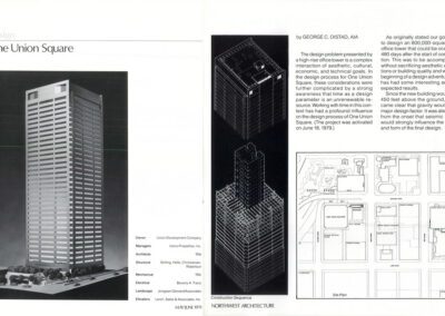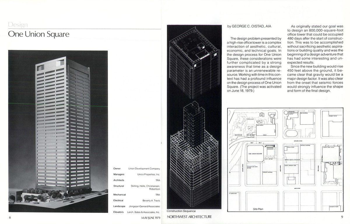 Notable TRA projects during Oistad’s tenure with the firm include the Peoples National Bank Headquarters (1973) in downtown Seattle; Office Building II / Social & Health Services Building (1975) on the capital campus in Olympia; One Union Square (1981, project director); the Camp Orkila – Wally Fisher Lodge on Orcas Island (1982 Citation, American Wood Council Design Awards); the Sheraton Hotel in Tacoma (1984, partner in charge, Seattle AIA Honor Award); Correction Centers in Monroe and Clallam Bay; the Washington State Convention Center (1986-88); the Seattle Metro Bus Tunnel system and stations (1990); and the King County Aquatics Center (1990) in Federal Way.