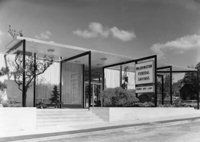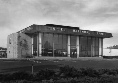 Outside the city projects include the Lincoln Federal Savings & Loan Bellevue Branch (1959); Seattle First National Bank (1959) in Olympia; Mid Columbia Bank (1953) in Pasco; the Peoples National Banks in Everett (1959), Federal Way (1960), Kirkland (1964), Bremerton (1964), Mountlake Terrace (1966), Renton (1967), and Tukwila (1968); the Washington Federal Savings & Loan branch in Bothell (1960), and the Walla Walla National Bank (1959).