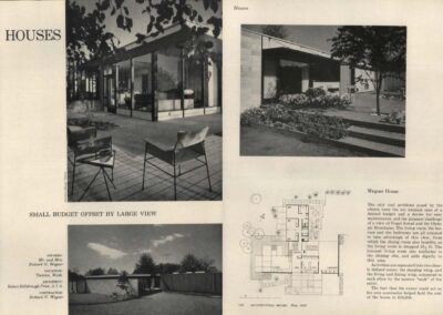 One of Price’s most notable projects was a 1959 model home for the Tacoma Home Show. Located in the Glenwood subdivision in Lakewood, “The Calypso,” was a strikingly modern house that offered no windows to the street and little landscaping in the front yard. Instead, the flat roof residence was oriented towards the fully landscaped backyard. Published in a variety of home magazines for the next seven years, the house was the 1959 honor award winner for the AIA-Sunset Western Home Award contest.