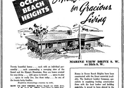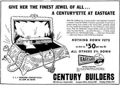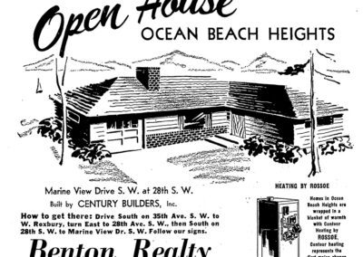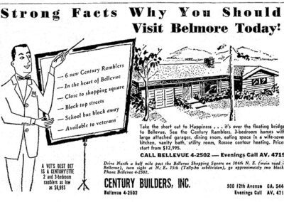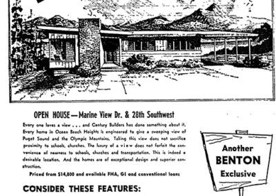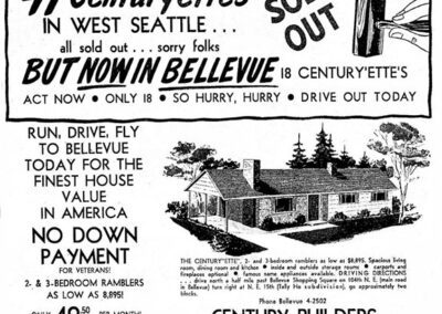 Projects by Century Builders included 20 homes at Ocean Beach Heights in Shorewood neighborhood of Burien (1953); 7 new “Century Ramblers” in the Tally-ho subdivision, Bellevue (1954); 52 homes in Glen Echo subdivision in SeaTac (1955); homes in Mansion Hills by Angle Lake (1955); homes in Holiday Hills and Glenwood in Bellevue (1955-56); 27 homes in Leilani Lane in Bellevue (1957); and 74 homes at West Seattle Fairway subdivision in West Seattle (1953). Many featured a modest ranch home which they called “Centuryettes,” built from a design by William H. Whiteley. Marketed as affordable GI Housing, 41 homes sold in 16 days in the Fairway subdivision when it opened.