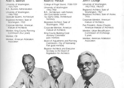 In a crushing blow to the partners, Anderson passed away suddenly at the age of 45 in March of 1970. Upon his death, the firm continued but was renamed Steinhart, Theriault & Associates (1971-1980). In 1981, John F. Courage was made a partner and the name was changed again; Steinhart, Theriault & Courage. By the time Steinhart retired in the late 1980s, his career spanned nearly four decades. He passed away in Seattle at the age of 87 on March 19, 1994.