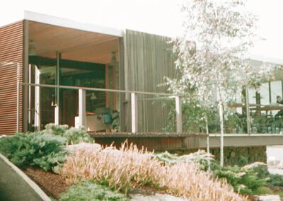 The partnership is perhaps best known for the design of its Miesian-style office building (1959) in Seattle’s Eastlake (1264 Eastlake Avenue). The 40’ x 28’ steel frame architectural office cantilevers some 14’ from the hillside offering a dramatic expression to passing motorists.