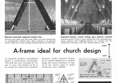 Religious projects include the A-frame St. Paul’s Episcopal Church (1962) in Seattle at the base of Queen Anne; Glendale Evangelical Lutheran Church (1967) in Burien; Calvary Lutheran Church (1963) in Seattle’s Magnolia neighborhood; and John Knox Presbyterian Church (c.1965) in Normandy Park.