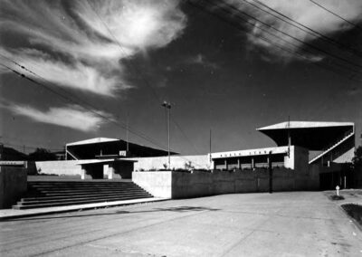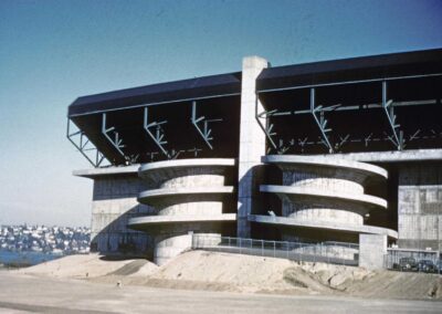 The firm also designed numerous apartment, commercial, and retail buildings. Notable designs included Overlake High School in Bellevue (1946), Memorial Stadium (1947; now part of Seattle Center), and the Green Lake Aqua Theater in Seattle (1950), an addition to the University of Washington Stadium South Stands (1950), the National Bank of Commerce (1956) in downtown Seattle and several branch banks across the Sound, as well as the Chapel (1958) at Veterans Hospital on American Lake.