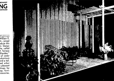 Later projects included a “Fashion in Design” vignette garden (1961, with Robert Chittock); the Herbert Schoenfeld House on Mercer Island (1961); the “Horizon Home” model house in Marine Hills (1962, Parade of Homes); the Brighton Place Apartments (1968, with Kenneth Koehler); the Frontier Homes Development (1968) in Arlington; the Herbert Crockett House (1973, with Robert Chittock); and Liberty Bay Park in Bremerton (1974, with Kenneth Koehler).