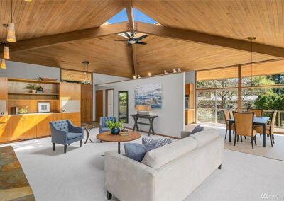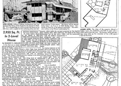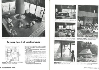 Other notable residential properties include the Otis White House (1961) on Mercer Island; the Donald Rokke House (1960) in Seattle; the Casa Carmel Apartments (1965) in Kirkland; and the Chalet Apartments (1959) in Bellevue. Non-residential designs include a warehouse and office building for Higgins Automatic Vending, Inc. (1959); the Sunde & d’Evers factory (1958) in Seattle; Cascade Security Bank (1964) in Enumclaw; the City of Seattle Traffic Engineering Division Office/Shop (1967); the Normandy Medical & Dental Building (1961) in Normandy Park; and the Rainier, Seattle-Tacoma Airport, Centralia and Fisherman’s Terminal branches for Seattle First National Bank (1964).