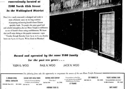 Throughout his career, Woo was heavily involved in a variety of social and civic organizations, particularly with the Chinese American community. He served on the Seattle Human Rights Commission (1965-1968) and was one of the founders. He was also a member of the Chong Wa Benevolent Association Board (1965), the governing body of Seattle’s Chinese community, and was founder and President of the Chinese Community Service Organization (early 1960s). In 1971 Woo served as President of the Wing Luke Museum (1971) and was a board member of China Club of Seattle. He was also a member of the Jackson Street Community Council and Seattle Urban Renewal Enterprises, all while being an active member of the Chinatown Chamber of Commerce. He also served as President of the Puget Sound Mycological Society (1964). From 1983 to 1989 Woo served on the Seattle Chinatown-International District Preservation & Development Authority board.
