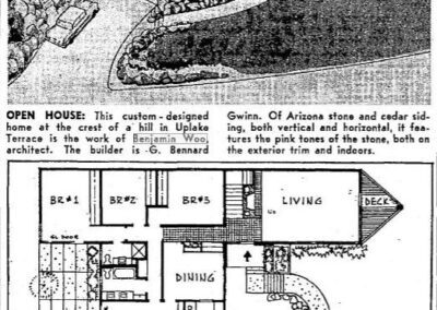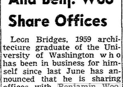 For unknown reasons in 1964 the partnership dissolved and Woo opened his own firm, sharing office space with architect Leon Bridges. During this time, he designed First Federal Savings & Loan Bank, Renton (1967-1968), Sunset Plaza Veterinary Clinic (1964) in Bellevue, the first home of the Wing Luke Museum (1967), the Dr. L.C. Hoover House (1968) in Edmonds, and a remodel of the Tai Tung Restaurant (1968) in Seattle’s Chinatown/International District.