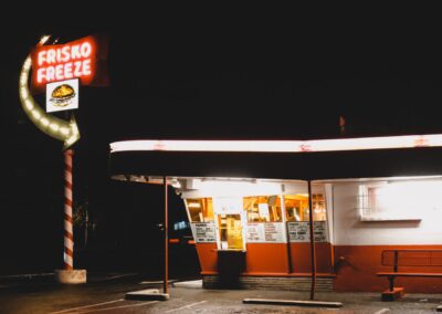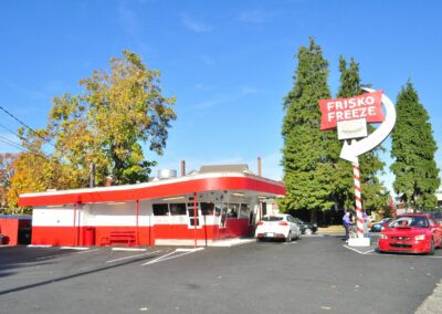 Frisko Freeze has been in continuous use as a food stand since it was built in 1950 and is now a well-known and much loved Tacoma icon. Its parking lot has served generations of Tacoma’s teenagers and young adults as an important social site, and its original owner, Perry Smith, was a well-known Tacoma businessman, especially for his personal and financial contributions to the city’s youth. This simple commercial building and its neon sign represents an early, and one of the few remaining examples of Googie architecture from Tacoma’s early 1950s. The building, both architecturally and culturally, represents the post-WWII building boom and the emergence of the mid-century American teenage culture in Tacoma.