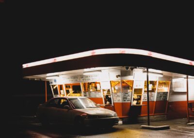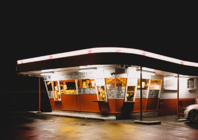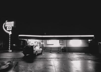 From the beginning, Perry designated the front service windows as a drive-thru where customers could place their orders from within their cars. Perry later claimed it was the first drive-thru service in Tacoma. He and his wife, Bobbe, did not have any restaurant experience prior to opening Frisko Freeze. As a family-run, independent business, they had to develop their own recipes and kitchen operations unlike franchise operations. Frisko Freeze’s hamburgers and milkshakes achieved legendary status, having frequently been featured in “Best of” lists over the years. Governor Booth Gardener was such a fan that he kept a photograph of the business on the wall of his Olympia office, and his “addiction” to the food was a frequent comment in the press.
