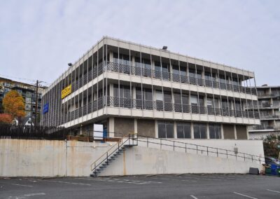 Because of the building’s size, scale and visibility, all facades appear primary, although the south and west facades are clearly more visible. The appearance of the facades varies, due to the topography and the architectural composition. This results in what appears to be a two‐story primary west facade, facing onto Dexter Avenue N, and three story facades on the north, south, and east. In response to internal functions and the view opportunities, the western half of the building is largely solid, with few penetrations but for doorways, while the eastern half is largely transparent due to full‐height windows on the upper floors and a wide band of east‐facing windows on the first floor. Wall infill consists of solid material – scored concrete and the concrete block treated with cement plaster cladding with an “oversize aggregate” or “marblecrete” finish as cited on the original elevations—or fenestration.